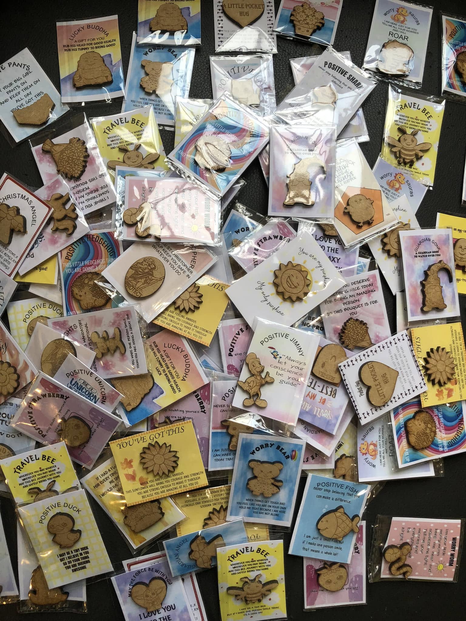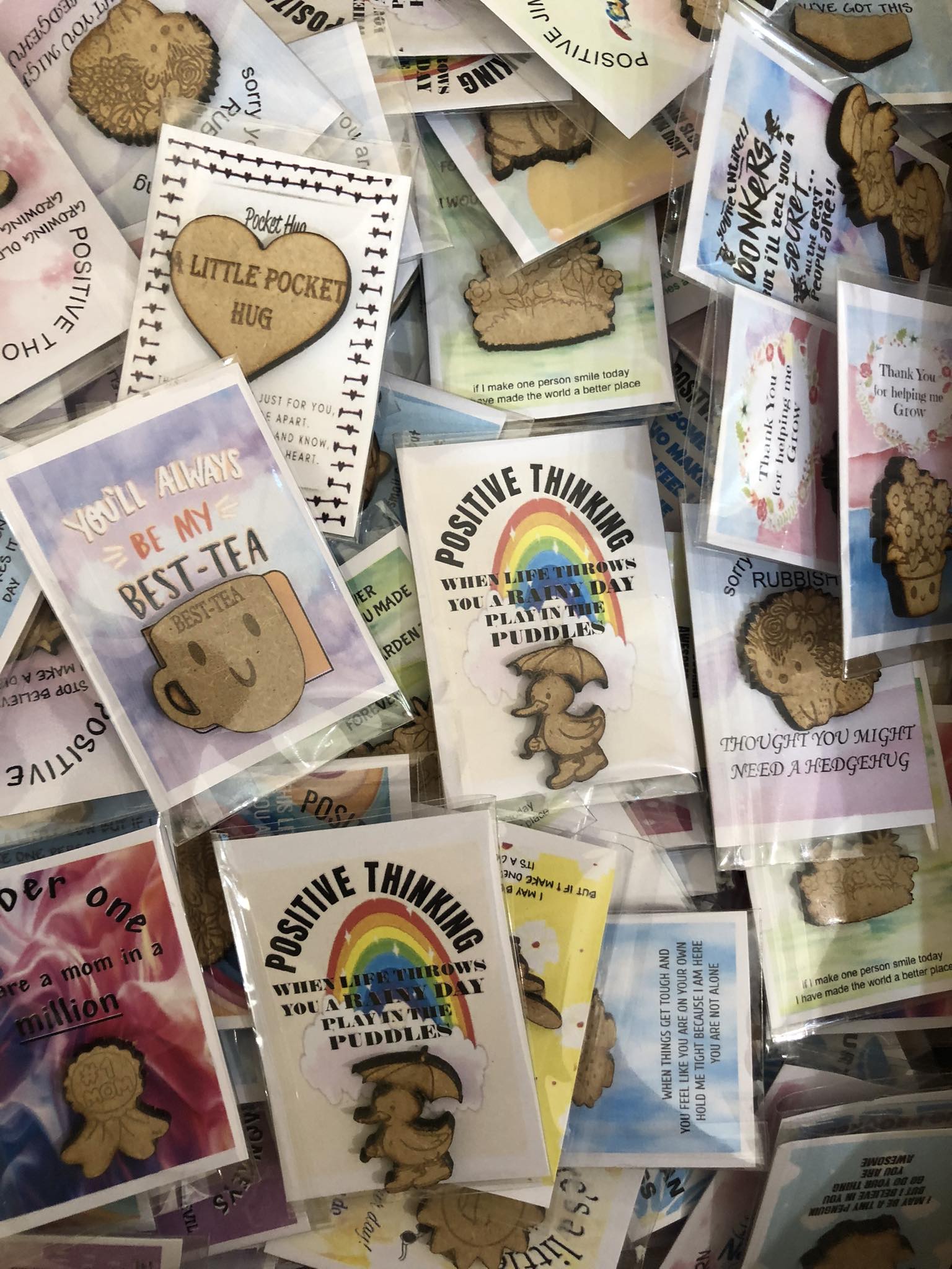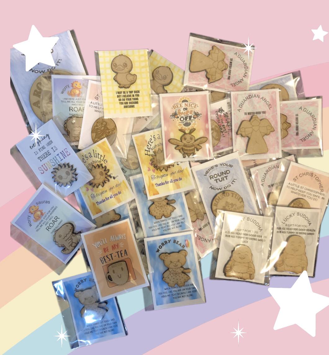 Bring a smile to someone’s day with these adorable MDF pocket keepsakes — each one mounted on its own colourful backing card and sealed in a neat cello packet. Every piece carries a tiny message of comfort, courage, luck or positivity, making them perfect for thank‑you gifts, order extras, party favours, school rewards, wellbeing boxes, craft fair fillers and so much more.
