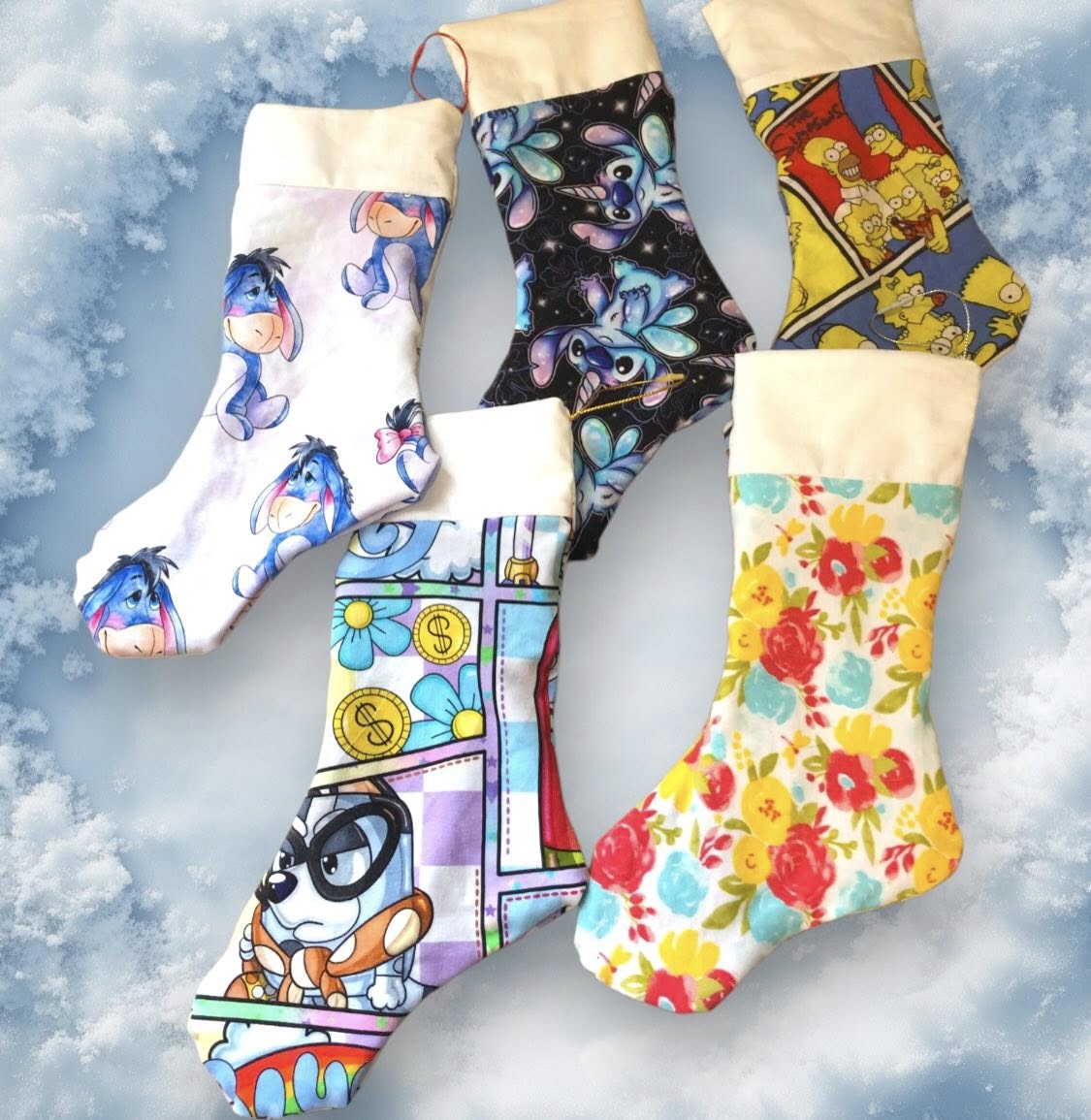 Stock up for the season with a wholesale lot of 25 handmade 9-inch Christmas stockings — each one fully lined, complete with a hanging hoop, and ready to dazzle!